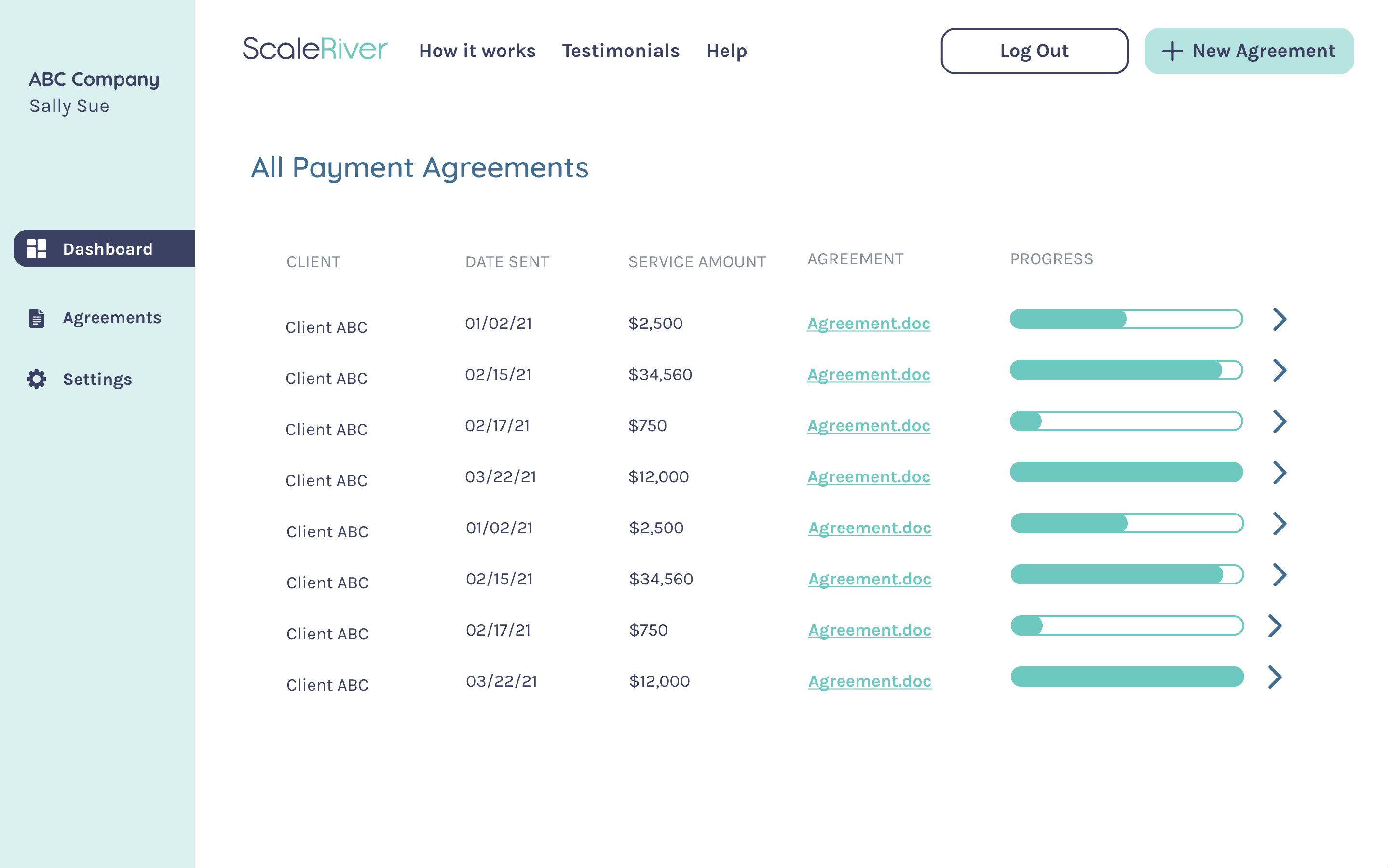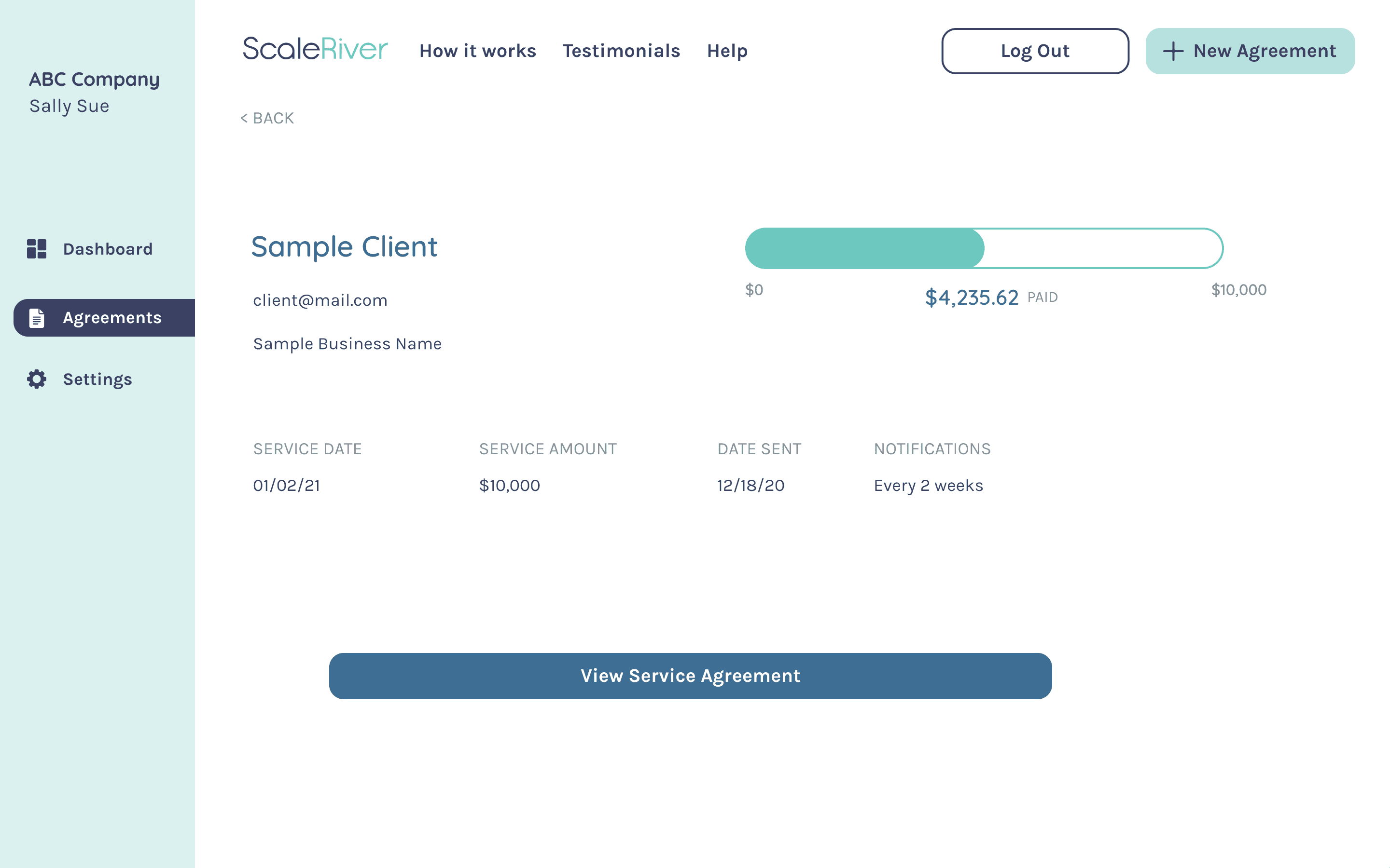 At any point in time, you can see where your Rivers sit and how your clients are paying you back. You can also setup notifications for when a new River is paid.